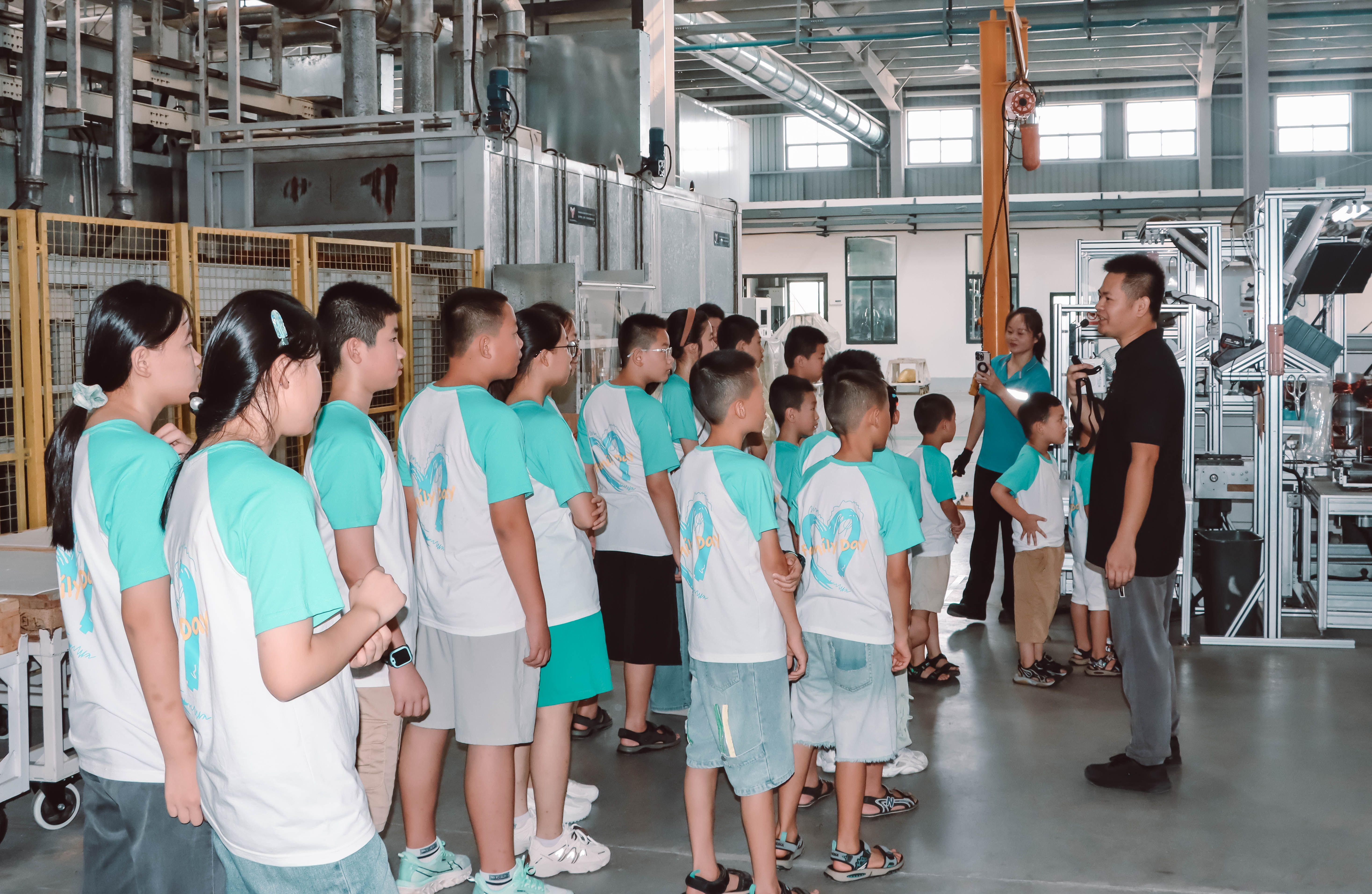 随后,在Kevin和Jim的带领下, 孩子们分成两队兴致勃勃地踏上了厂区参观之旅。他们亲眼目睹了精密的CNC加工、灵活的机器人操作、严谨的装配流程和专业的实验测试。孩子们驻足观看,不时发出惊叹,对父母每日辛勤工作的内容与环境有了直观而深刻的感受,理解了父母工作的价值与不易,心中充满了敬意。